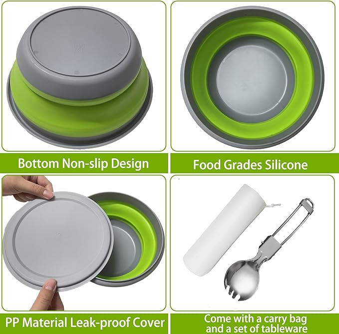 - 【What You Get 】A set of 3 collapsible silicone camp bowl with lid, 1 Pcs carry bag and a set of 3 Pcs tableware(1*fork,1*spoon,1*chopsticks).Ideal for preparing or storing food.