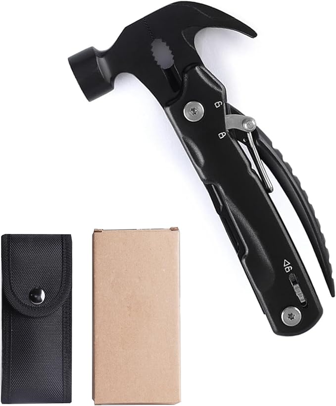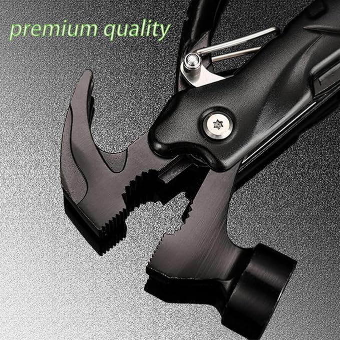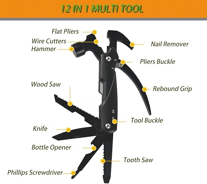 - 【Multi-function all-in-one design】: This multi-tool combines a mini hammer, flat-nose and pipe wrenches, nail remover, wire cutters, flat and Phillips screwdrivers, serrated knife, nail file, bottle opener, pocket knife, saw—12 functions in total—integrated into one to meet your needs for various daily life and outdoor operations, making it essential camping gear and cool stuff.