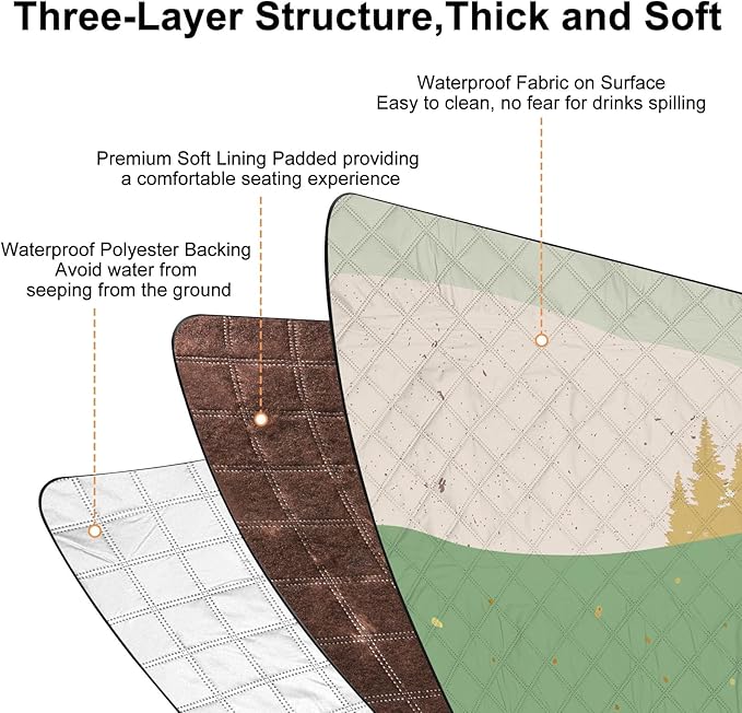 - Soft & Thick Three -Layer Structure: Our picnic blanket is crafted with a top layer of comfortable polyester fabric, a middle layer filled with plush microfiber, and a waterproof polyester film bottom, this three-layer construction, enhanced by high quality sewing technology, offers unmatched comfort and durability, ensuring that your picnic experience is as enjoyable as it is luxurious