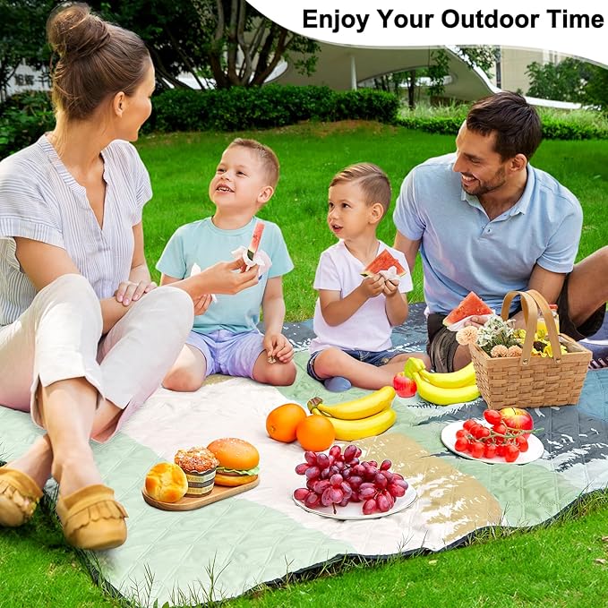 - Soft & Thick Three -Layer Structure: Our picnic blanket is crafted with a top layer of comfortable polyester fabric, a middle layer filled with plush microfiber, and a waterproof polyester film bottom, this three-layer construction, enhanced by high quality sewing technology, offers unmatched comfort and durability, ensuring that your picnic experience is as enjoyable as it is luxurious