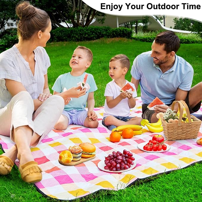 - Soft & Thick Three -Layer Structure: Our picnic blanket is crafted with a top layer of comfortable polyester fabric, a middle layer filled with plush microfiber, and a waterproof polyester film bottom, this three-layer construction, enhanced by high quality sewing technology, offers unmatched comfort and durability, ensuring that your picnic experience is as enjoyable as it is luxurious