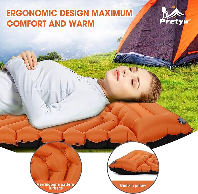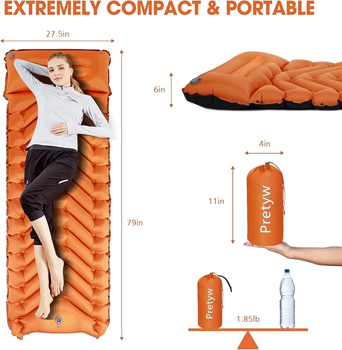 - 【Upgraded Support & 4" Thick Sleep Support】Crafted with the toughest outdoor-grade material, Pretyw sleeping pad for camping is ideal for any weather. Measuring 79 x 27.5 x 4 inches, our self-inflating air mattress is long enough for taller individuals. The 4-inch thickness and upgraded support make it perfect for side sleepers, and the built-in pillow adds extra comfort and convenience. This setup ensures a restful sleep during extended outdoor excursions.