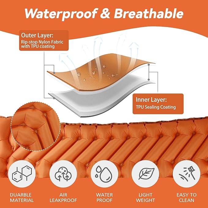 - 【Premium Nylon and TPU】Our sleeping pad is made from ultra-thick 40D nylon with a multi-layer TPU design, ensuring outstanding durability and waterproof performance. It won’t tear, even on rough terrain. Cleaning the inflatable camping mattress is a snap—just wipe it down. Plus, the air mattress includes three repair patches for quick fixes if the inflatable pad gets damaged.