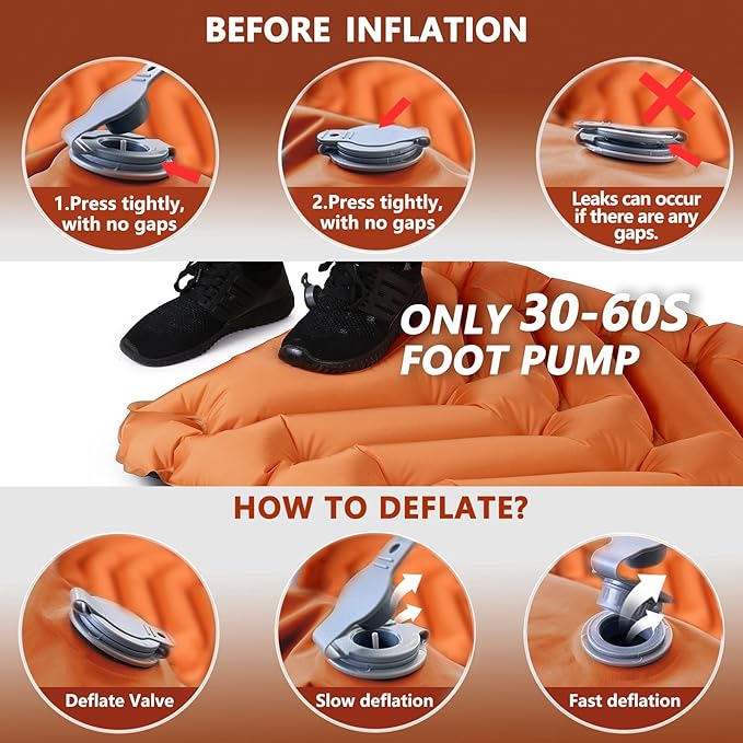 - 【Foot Press to Inflate-Only 30-60s Needed】No need to use your hands, mouth, or a pump to inflate our camping sleeping pad. Just step on the built-in pump spot with your foot, and it fully inflates in 0.5-1 minutes. With anti-leak valves, you don't have to worry about air escaping! Plus, it deflates super quickly—just pull out the deflation plug.
