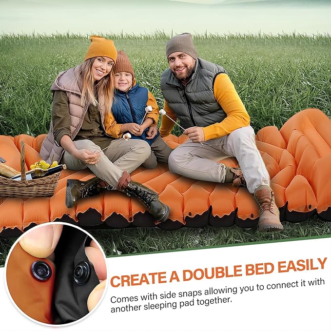 - 【What You Will Get?】The package includes 1 sleeping pad, 1 storage bag, 1 Binding Belt, 1 instruction manual, and 3 patches. This sleeping pad features the latest unique design with buttons on both sides for easy connection with other pads to form a double bed, providing extra relaxation space. We believe you'll love our inflatable sleeping pad. If you have any questions or are not satisfied, please contact us anytime, and we will provide the best solution.