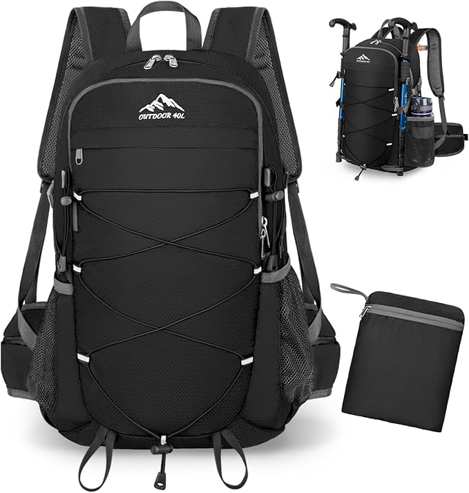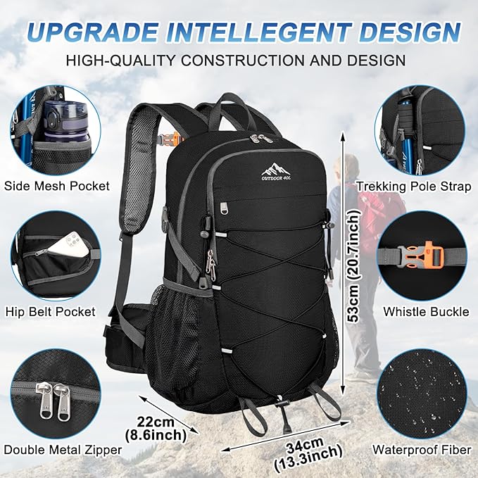 - Multi Compartment Foldable Backpack: 40 liter backpack dimension: 13.3×8.6×20.7 inch with large capacity 40L; Hiking day pack includes a main pocket,2 zipper front pocket,2 side pocket, 2 waist zipper pocket,1 back wet pocket to keep your thing