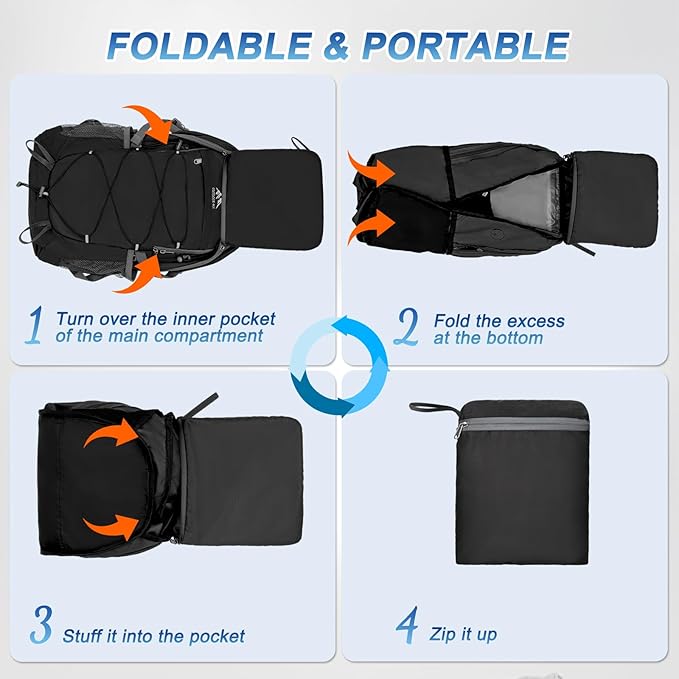 - Foldable Design: Hiking back pack foldable size: 11.0"(L)×8.7"(H)×2.4"(W). The camp backpack with the light weight 1lb can be easily folded into its own pocket stored in bag