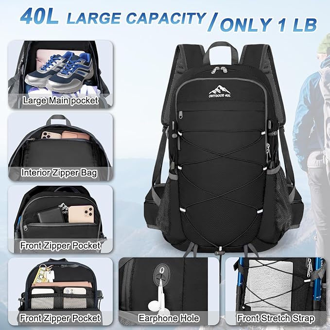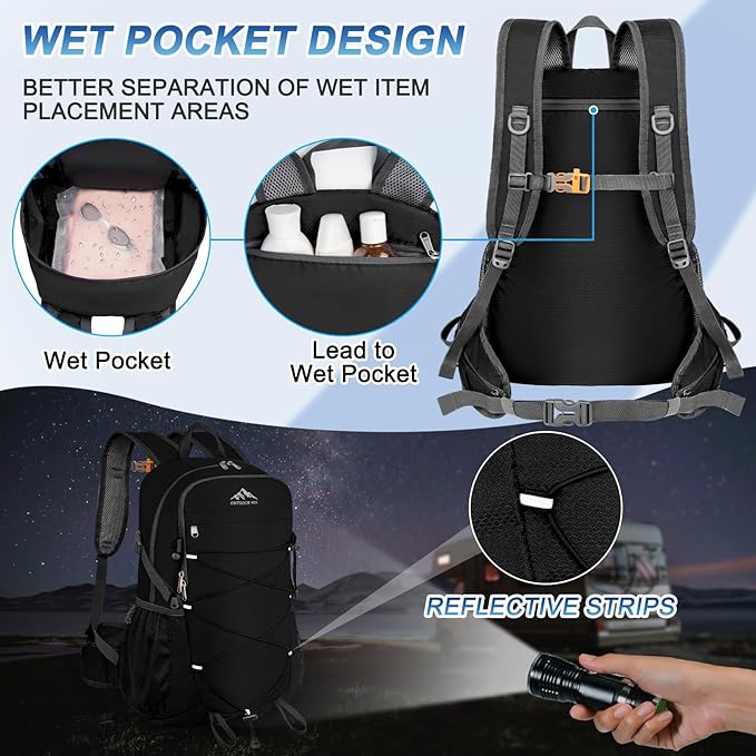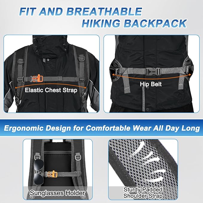 - Convenient Design: Wet-proof pockets inside lightweight hiking backpack for storage of wet items. Waterproof hiking backpack for men women with trekking pole attachment and front stretch strap. Day pack backpack for hiking have sunglasses holder and headphone hole