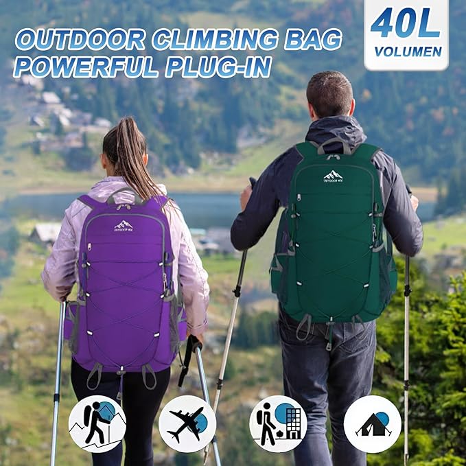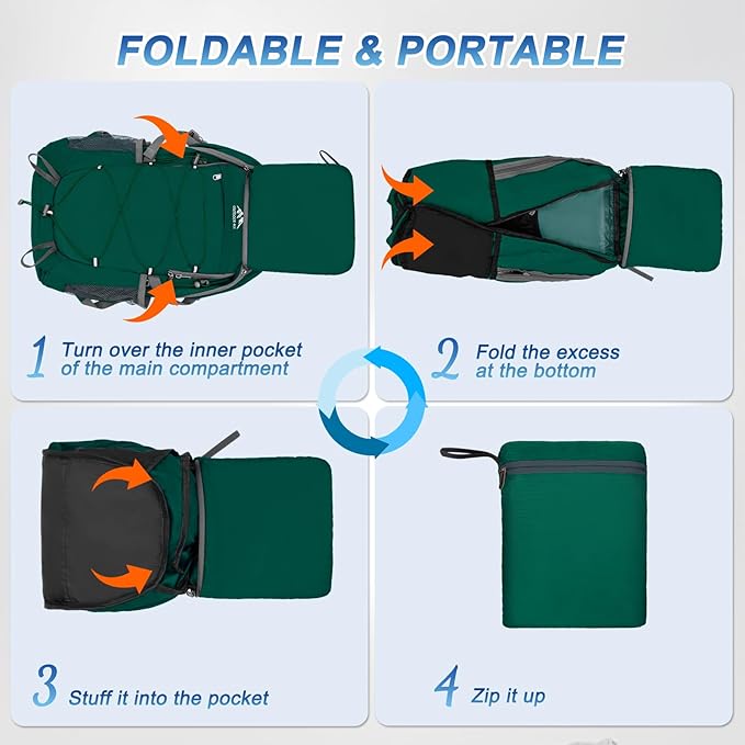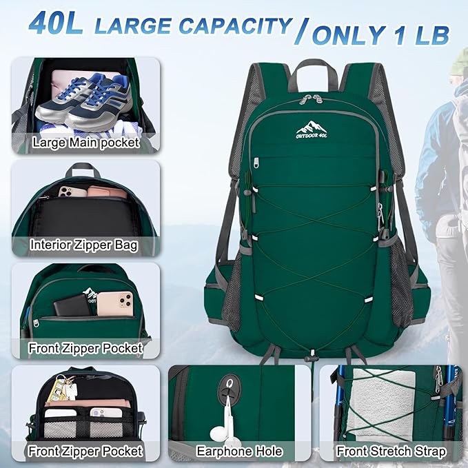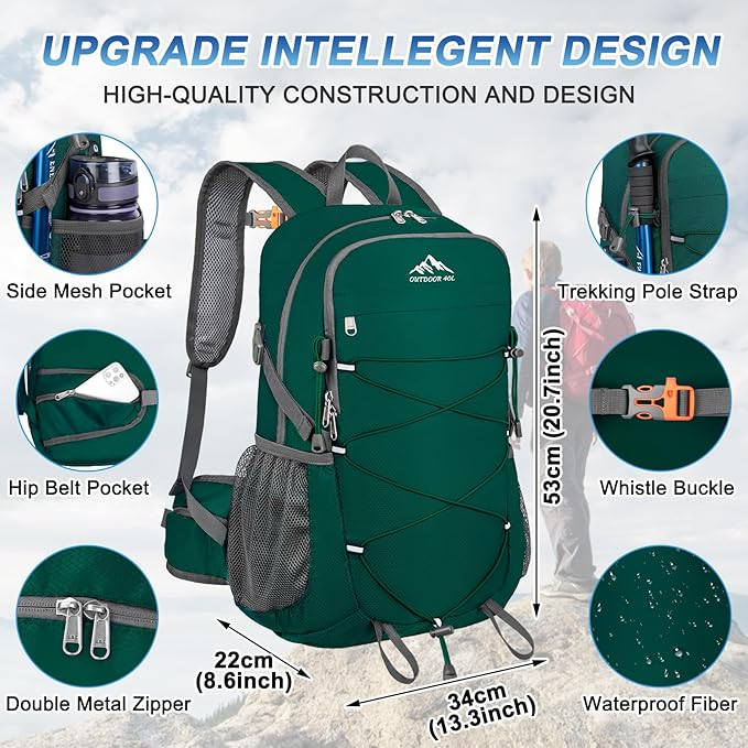 - Multi Compartment Foldable Backpack: 40 liter backpack dimension: 13.3×8.6×20.7 inch with large capacity 40L; Hiking day pack includes a main pocket,2 zipper front pocket,2 side pocket, 2 waist zipper pocket,1 back wet pocket to keep your thing