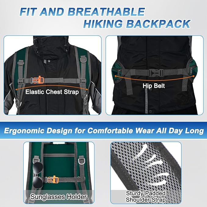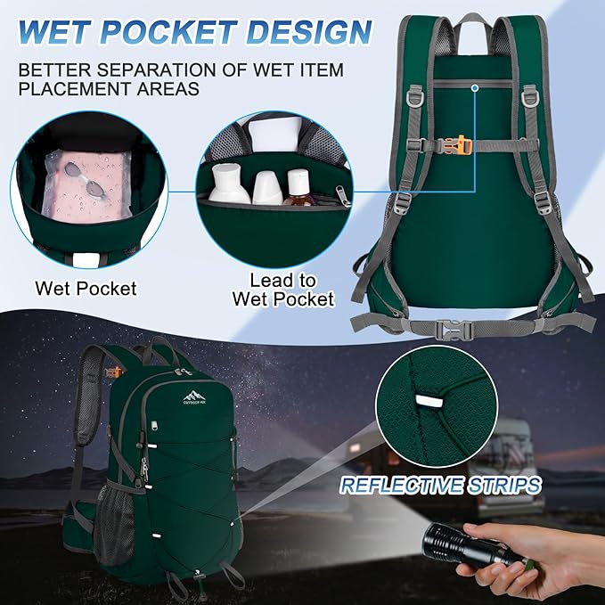 - Convenient Design: Wet-proof pockets inside lightweight hiking backpack for storage of wet items. Waterproof hiking backpack for men women with trekking pole attachment and front stretch strap. Day pack backpack for hiking have sunglasses holder and headphone hole