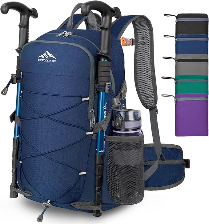 - Multi Compartment Foldable Backpack: 40 liter backpack dimension: 13.3×8.6×20.7 inch with large capacity 40L; Hiking day pack includes a main pocket,2 zipper front pocket,2 side pocket, 2 waist zipper pocket,1 back wet pocket to keep your thing