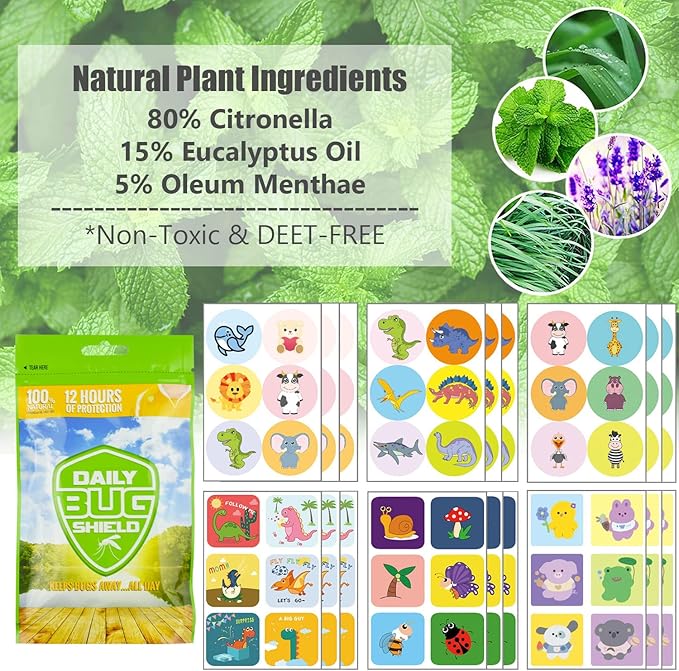 - Natural Plant Based Ingredients : Our mosquito patches for kids are made with natural Ingredients such as: Geraniol Oil, Lemongrass Oil and Citronella Oil. Deet-free and safe for children and baby.