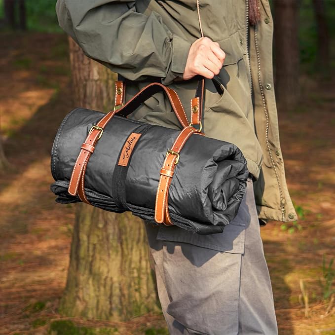 - OVERSIZED: 79" x 59" (similar to a queen-sized mattress), our large outdoor camping blanket comfortably accommodates up to 2 adults, perfect for romantic getaways, family gatherings, and various outdoor activities. Weighing only 4 pounds (with straps), it comes with leather handles and shoulder straps for easy storage and portability, perfect for worry-free outdoor adventures.