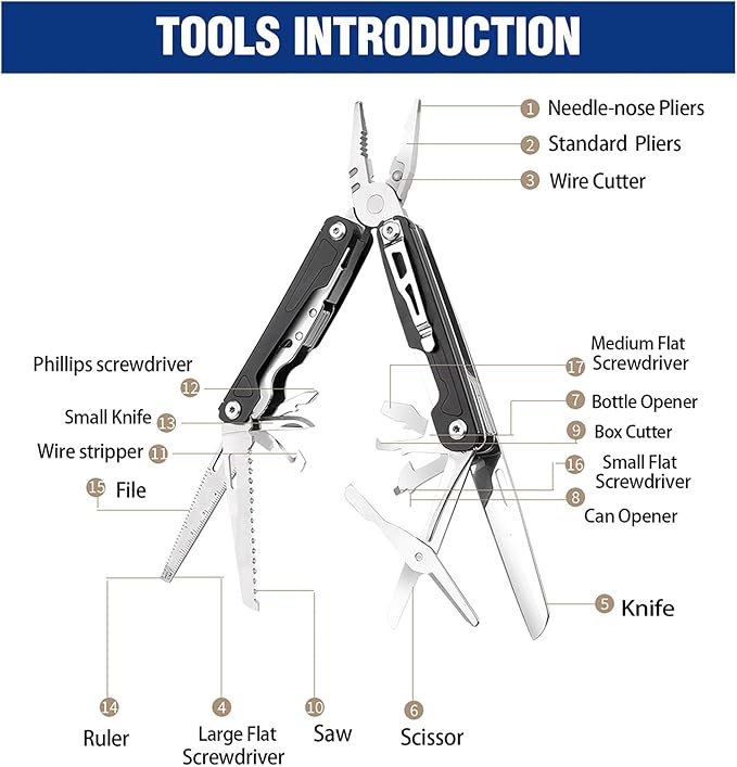 - 【17-in-1 Multi Tool】The multi tool comes with 17 small accessories, including long nose pliers, regular pliers, wire cutter, , scissors, wire stripper, can opener, wood/metal file, rope cutter,Knifes, large & small slotted screwdrivers, Phillips screwdriver and saw.