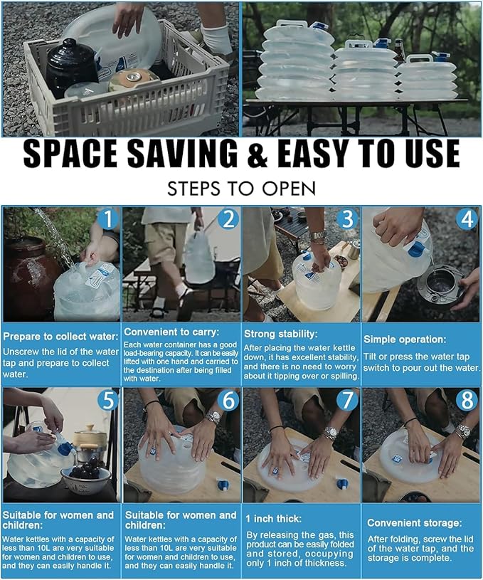 - Light & Compact & Portable & Reusable: This Design Is Lightweight, Compact, and Portable, Making It Easy to Store Thanks to Its Foldable and Space-Saving Features. It Remains Soft and Pliable Even in Cold Conditions While Retaining Its Shape, Making It Easy to Fill, Dry, Drain, and Reuse. Perfect for Outdoor Activities Such as RVing, Hunting, Dog Camping Gear, Camping Storage, Emergency Preparedness Items, Hiking, Backpacking, Fishing, Picnics, Survival Water, Barbecues, Camping Must-Haves.
