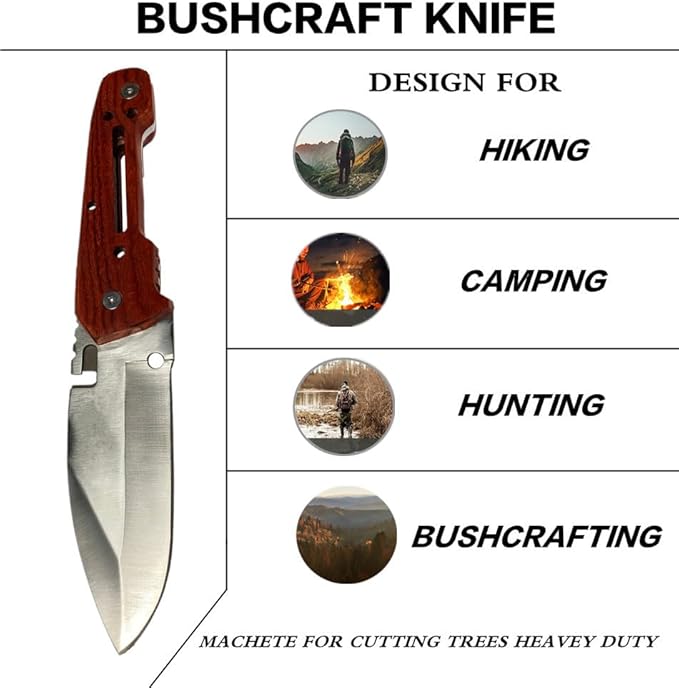 - 【Ergonomic Wood Handle&Knife Sheath for EDC】:Ergonomic wood handle knife include comfortable grips and save energy during heavy duty work.Wood handle offers a good amount of grip which generally increases when the wood gets wet.The bush knife with sheath is easy to carry.