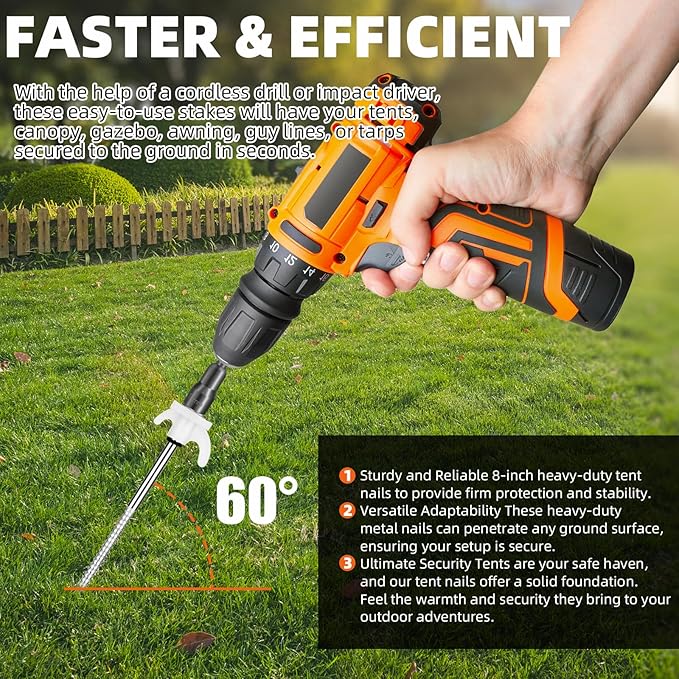 - EASY TO USE: Our tent stakes setup quickly and easily. With a cordless drill or impact driver, you can secure your tents, canopy, gazebo, or tarps to the ground in seconds, giving you more time to enjoy your camping experience.
