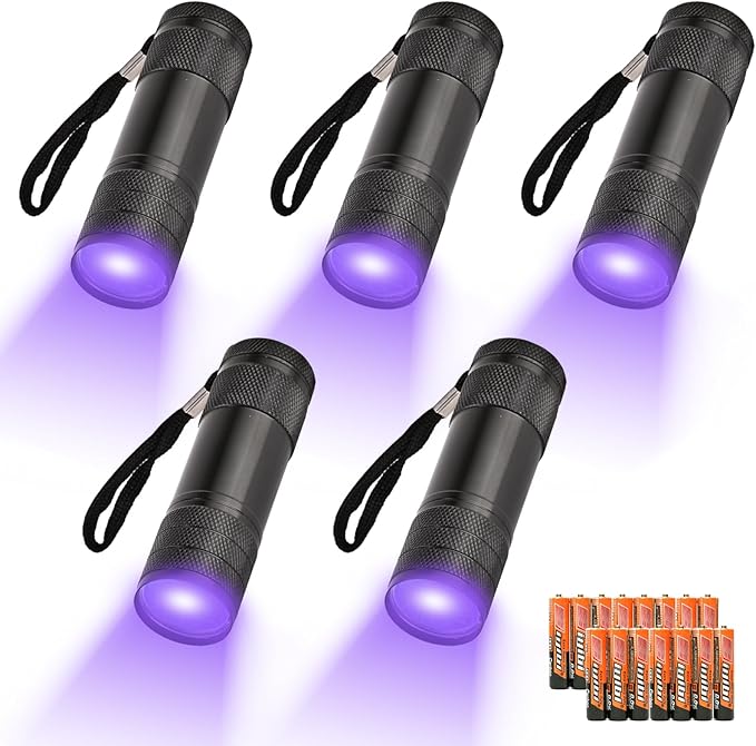 5 Pcs UV Black Light Flashlights Bulk, 9 Led 395-400nm Mini Blacklight Handheld Portable Torch Pet Urine Detector for Bed Bug, Hair, Dog Cat Urine and Stains Batteries Included