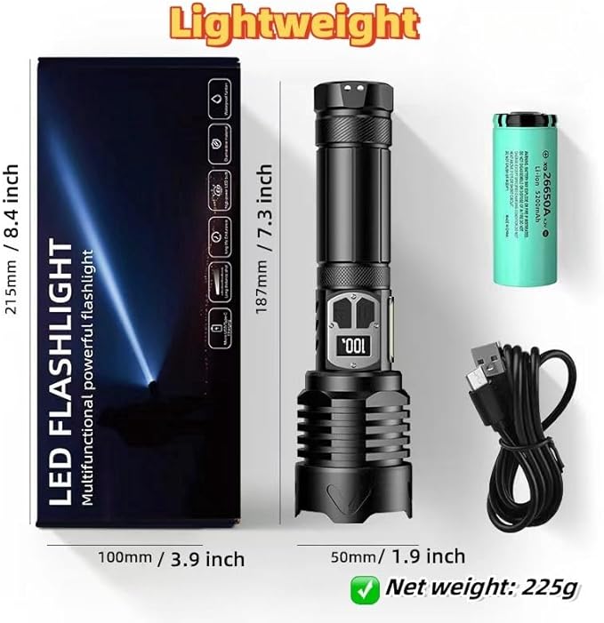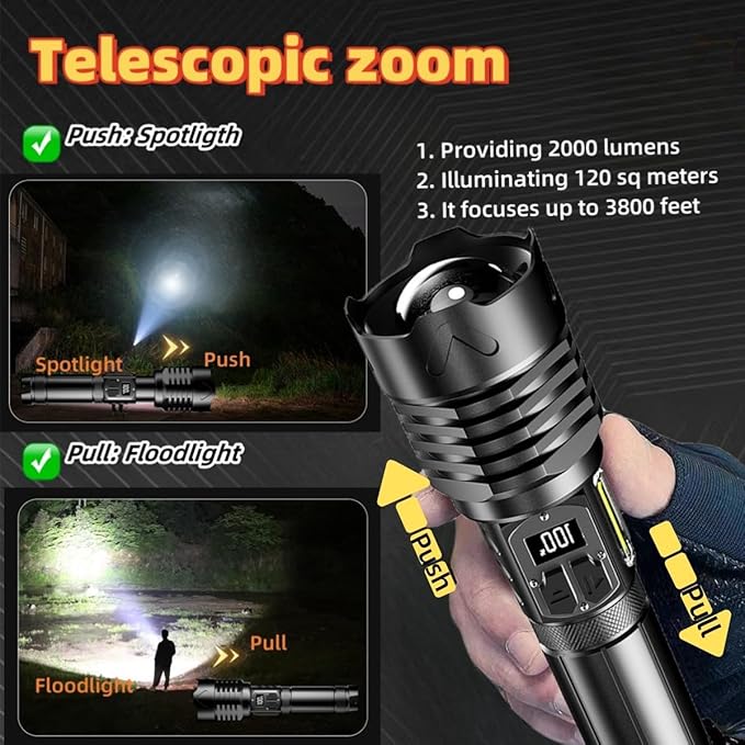 - 1. High Lumen, Adjustable Focus LED Flashlight: Jumpso streamlight flashlight uses an upgraded 30W white laser LED chip, providing 25000 lumen super bright and illuminating 120 sq meters. It focuses up to 3800 feet long range, ideal for outdoor activities and emergencies.