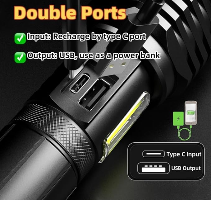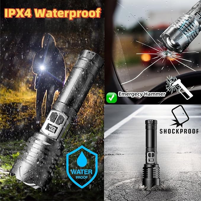- 4. Multi-Functional, IPX4 Waterproof: Made of aluminum alloy, this rechargeable flashlight is shockproof and wear-resistant. It is IPX4 waterproof for outdoor use. Fast charging via Type-C fully charges the battery in 3-4 hours. It can also serve as a power bank for USB devices.