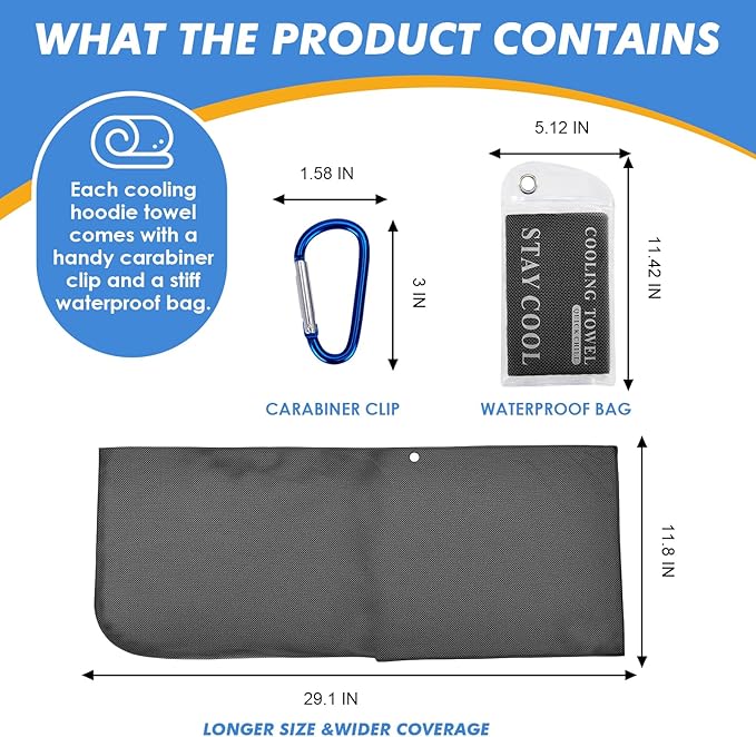 - 【DESIGN FEATURES】: Measuring "29x12", the cooling hoodie towel offers ample coverage for your neck and face and other body areas. Expanding the size brings better cooling effects. Crafted from high-quality materials, these towels are durable and longevity, providing a dependable, cost-effective cooling solution for the long term. Feel free to contact us for any issues.
