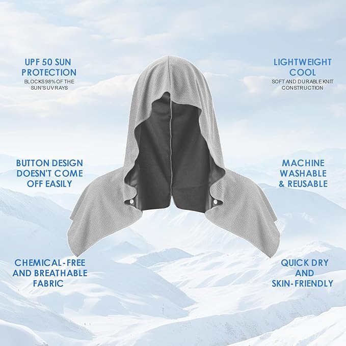 - 【QUALITY MATERIAL】:Cooling hoodie towel is made of high-quality microfibers with a mesh pattern, is breathable, UV protection, lightweight soft, durable and easy to fold. Not only skin-friendly for the neck and face or other body areas, it's also chemical-free and safety for all users. The special structural design allows it to maintain cooling and dissipate heat in summer.