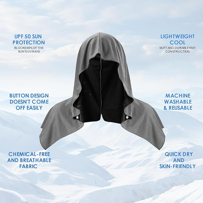 - 【QUALITY MATERIAL】:Cooling hoodie towel is made of high-quality microfibers with a mesh pattern, is breathable, UV protection, lightweight soft, durable and easy to fold. Not only skin-friendly for the neck and face or other body areas, it's also chemical-free and safety for all users. The special structural design allows it to maintain cooling and dissipate heat in summer.