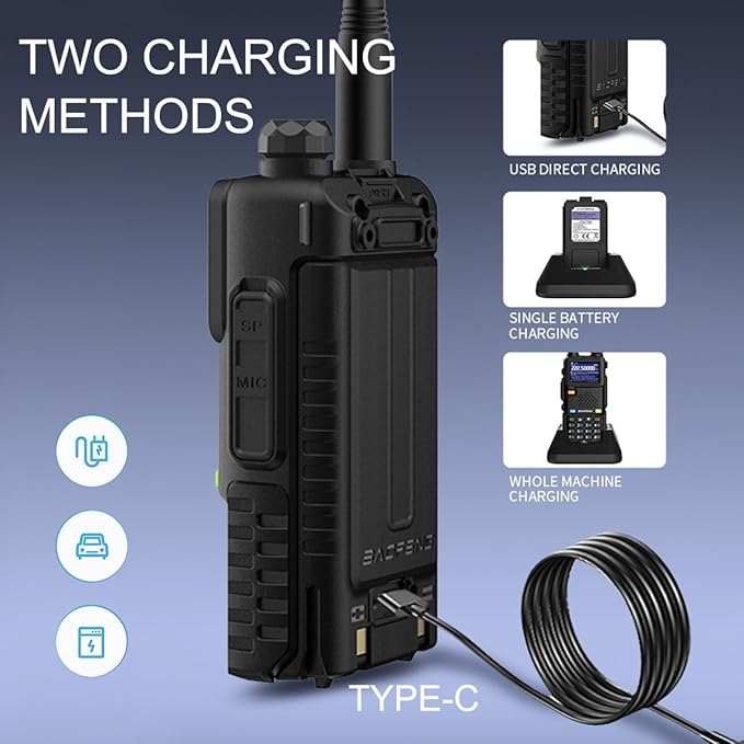 - The 5RM two way radio supports CHIRP programming. The 2500mAh high-capacity rechargeable battery is equipped with a TYPE-C connector for charging on mobile chargers with USB slots, laptops, or cars, ensuring that you can charge anytime anywhere without worrying about power.