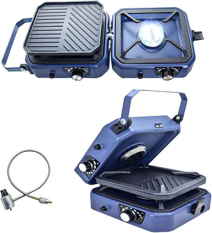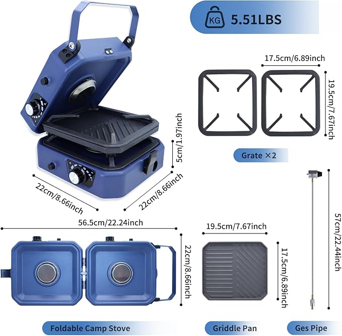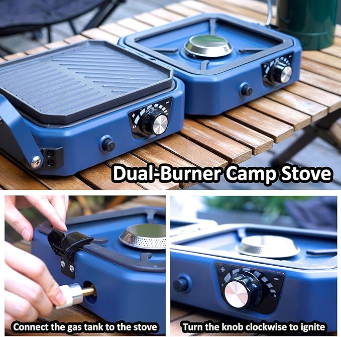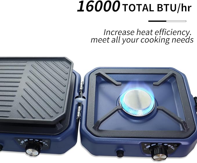 2 Burner Propane Camping Stove with Grill - CloudHand Foldable Camp Stove with 16,000 BTU, Two Adjustable Burners with Piezo Ignition & Easy Carrying Handle (Blue)