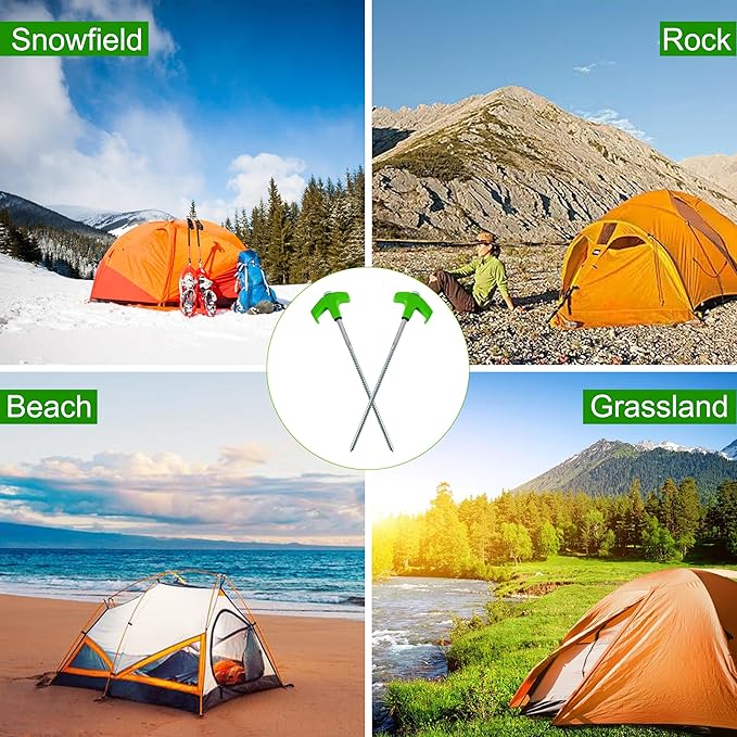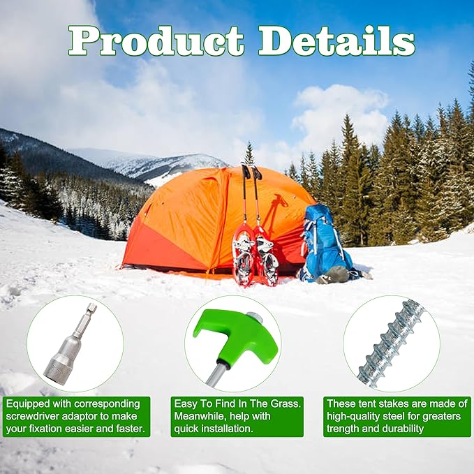 - 【Screw In Tent Pegs】Unlike conventional tent pegs, these screw stakes employ a screw-in system that allows for effortless insertion and removal. Whether pitching your tent on grass, hard dirt, gravel, or any other surface, rest assured that these stakes will provide a secure hold.