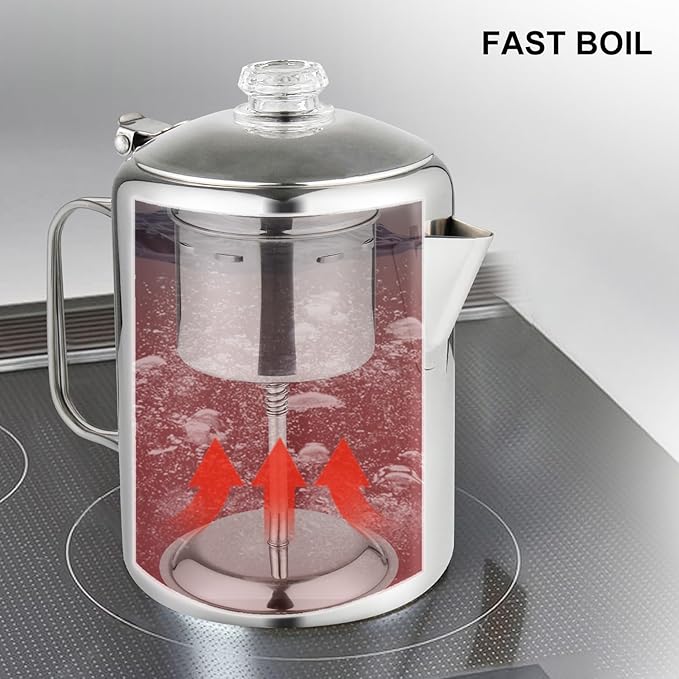 - 【PERMANENT FILTER BASKET】This percolator coffee pot features a permanent filter basket, so you don't need to use messy coffee filters. The permanent filter basket is made of food grade stainless steel, making it very easy to clean and reuse.
