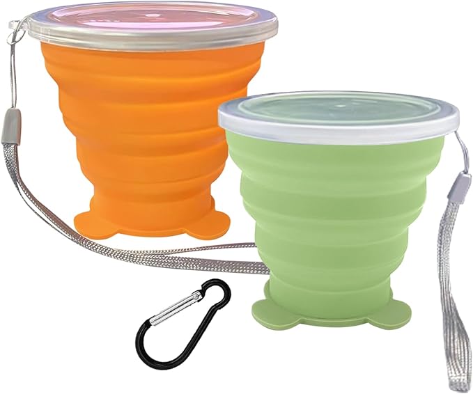 2 Pcs Collapsible Cup, Silicone Collapsible Travel Cup, Expandable Folding Camping Drinking Cup with Lids Reusable Small Portable Mugs Cup for Travel, Camping, Hiking,Outdoor Sports (Orange&Green)