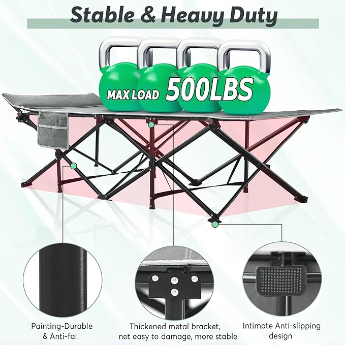 - Durable and Long-lasting--The upgraded version of the cot bed is made of double layer 600D Oxford cloth, designed with 10 tubular iron legs and 25mm thick square tubes to provide stability, featuring superb strength, supporting a max capacity of 500 pounds.
