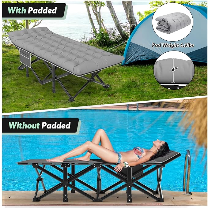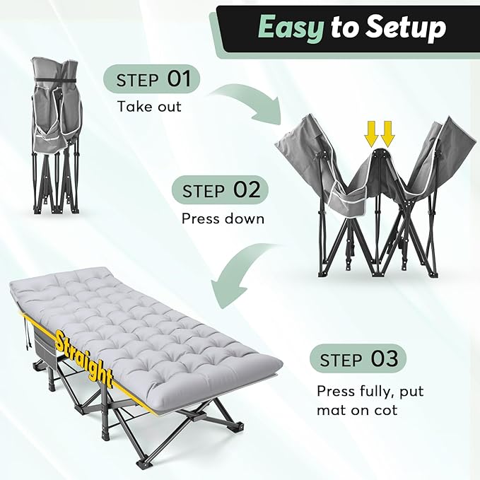 - Portable & Folding--Camping cots offer the convenience of easy portability, allowing you to set up a comfortable sleeping space anywhere you go, lightweight(23.3 lbs), foldable, come with Oxford bag for hassle-free transportation. Say goodbye to uncomfortable sleeping arrangements on the ground.
