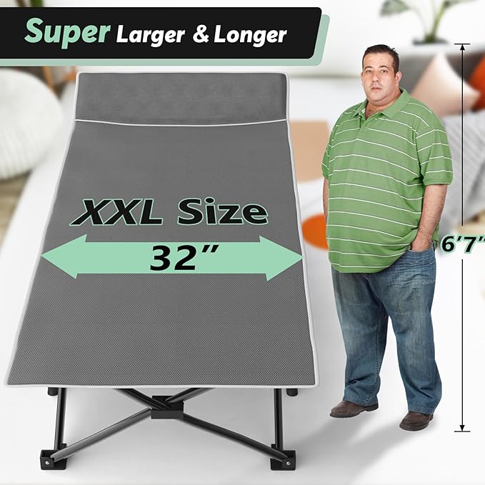 Slendor Oversized XXL Camping Cot, Folding Cot for Adults, 79" L x 32" W x 19" H Sleeping Bed with Mattress, Carry Bag, Camp Cot Bed for Travel, Guest, Support 500lbs