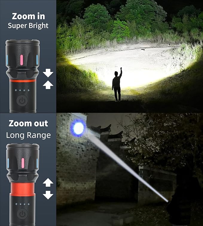 - 【Multifunctional】 The high lumens flashlights offer 3 different light modes - high, low, and strobe - allowing you to easily adjust the brightness according to your specific needs. Additionally, these flashlights feature a telescopic zoom design, enabling you to focus the beam for precise illumination at various distances