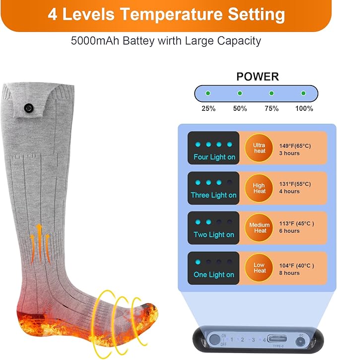 - 【4 Levels Temperature Controller】:The winter socks have 4 levels setting heat controller, you can easily adjust the comfortable temperature by short press the temperature setting button. There are Ultra high heat (65⁰C/149⁰F, 3 hours ,4 indicator lights on), high heat (55⁰C/131⁰F, 4 hours ,3 indicator lights on),medium heat (45⁰C/113⁰F, 6 hours,2 indicator lights on), and low heat (40⁰C/104⁰F, 8 hours 1 indicator lights on)