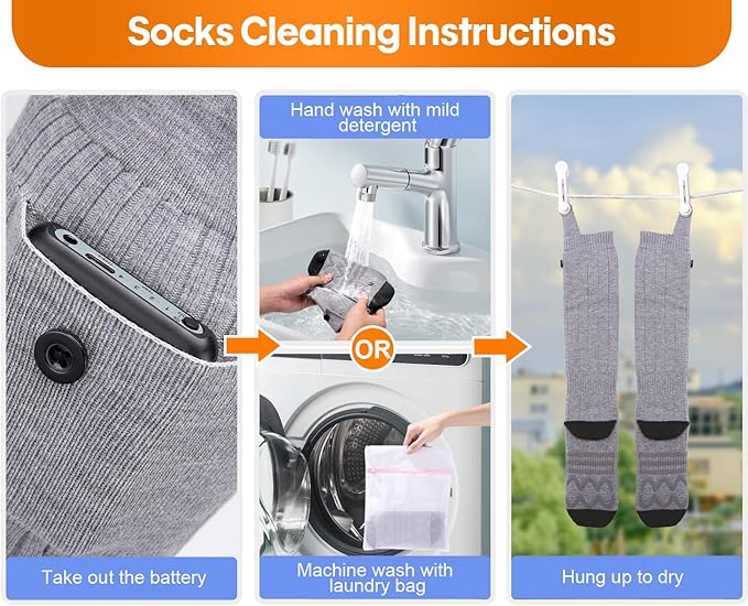 - 【Washable & Necessary for Winter】: This heated socks can be machine washed or hand washed. Just make sure to remove the battery before washing. When using machine washing, put socks in the laundry bag, and then put them in the washing machine. In addition, you must ensure that the socks are completely dry before heating them for use. Put the battery in the battery box on the sock, then turn on the button and you can start.(laundry bag included in the box of our heated socks)