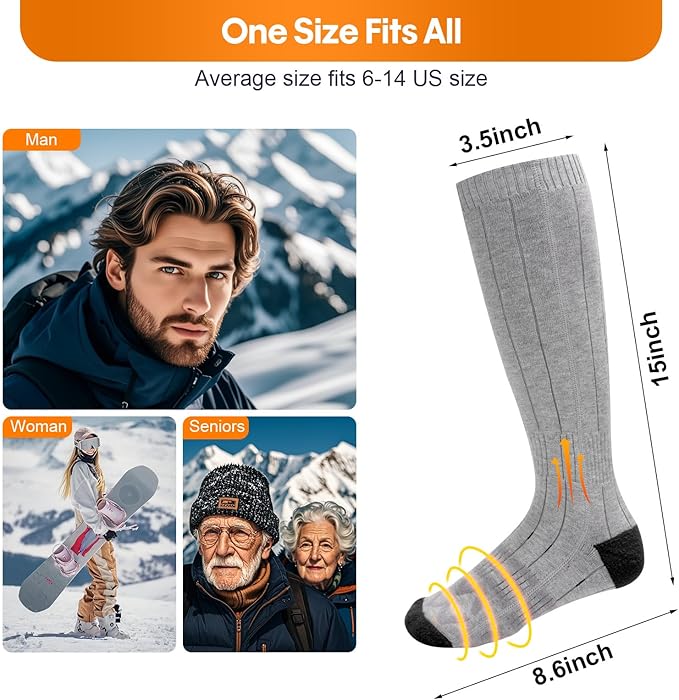 - 【Soft Comfortable & Warm Heated Socks】:Onedidy heated socks are made of pure cotton material. Combined with ergonomic design. So it's absorbent, breathable, quick-drying and elasticity. This rechargeable electric heated socks are designed for men and women, one size fit all, suitable for 6-14 Size. Suitable for all kinds of outdoor activities, such as skiing, fishing, hunting, cycling, hiking, running, shoveling snow, outdoor working, etc. The winter warm socks are your best choice