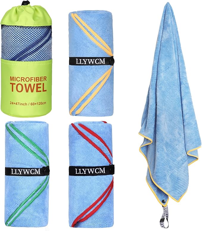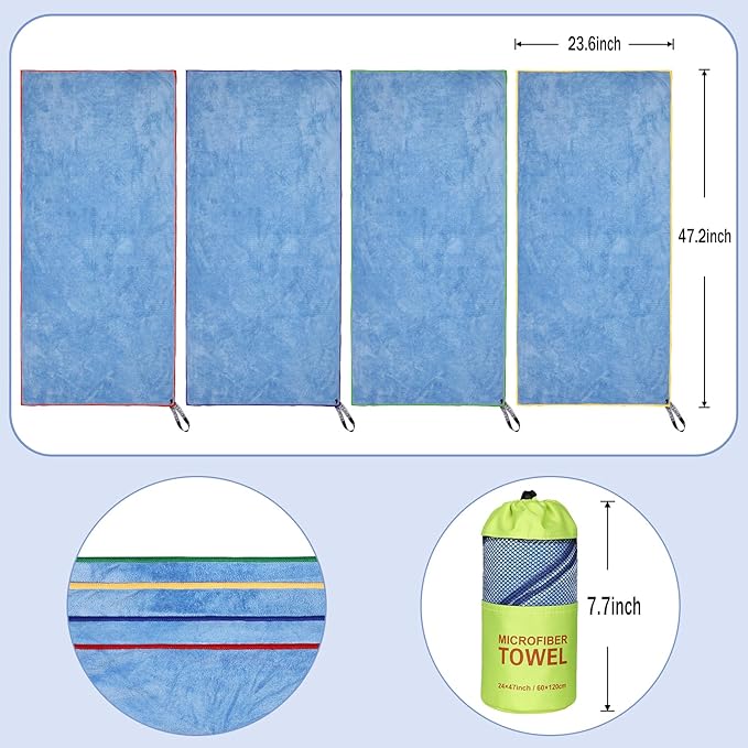 - UNIQUELY DESIGNED SET PACK: The high-quality waterproof towel set contains 4 microfiber camping towels and a separate mesh bag. The unique set pack design is convenient for your family or you and friends to choose between. Different seam marks on the edge of the towel make it easy to find the quick dry towel that belongs to you.