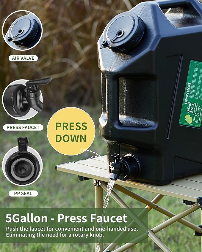 - Large Capacity Design: This 5-gallon (approximately 18.9 liters) water jug is perfect for camping, hiking, and outdoor activities. Whether it's for family camping or long-distance hiking, it provides ample water supply to keep you hydrated throughout your adventures.