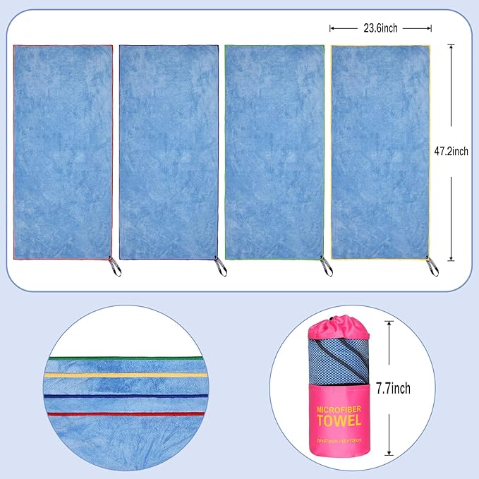 - UNIQUELY DESIGNED SET PACK: The high-quality waterproof towel set contains 4 microfiber camping towels and a separate mesh bag. The unique set pack design is convenient for your family or you and friends to choose between. Different seam marks on the edge of the towel make it easy to find the quick dry towel that belongs to you.