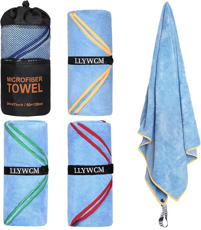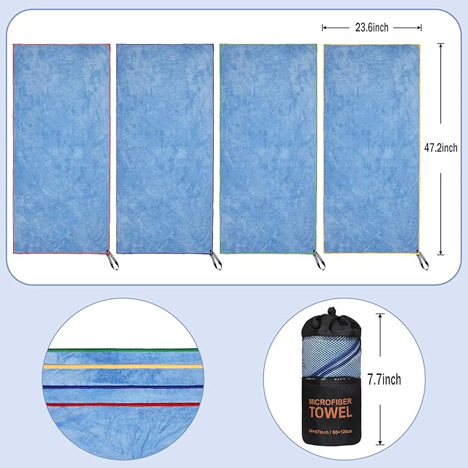 - UNIQUELY DESIGNED SET PACK: The high-quality waterproof towel set contains 4 microfiber camping towels and a separate mesh bag. The unique set pack design is convenient for your family or you and friends to choose between. Different seam marks on the edge of the towel make it easy to find the quick dry towel that belongs to you.