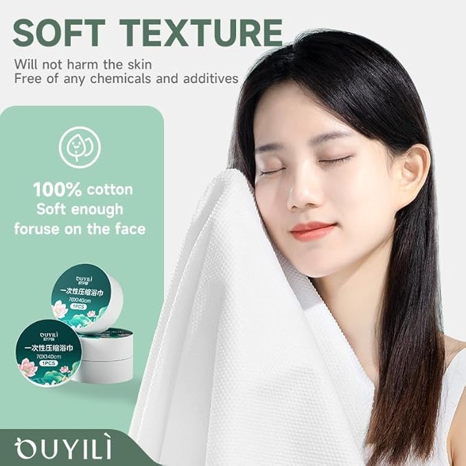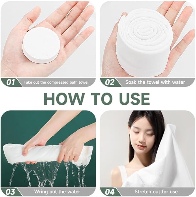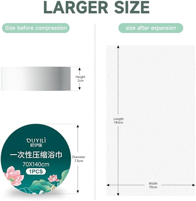 - COMPRESSED BATH TOWEL: Place the towel in water for 3 seconds and it will expand into a large towel of 56 x 28 inches (about 140 x 70 cm). MATERIAL: The towel is made of natural plant fiber, comfortable, safe and odorless. Suitable for both adults and children. WIDE USE: Great for carrying to various occasions, such as outdoor, emergency hotels, bathrooms, spas, offices and so on. [EASY TO CARRY] Small size and light weight, only 79 grams, easy to use, easy to store in backpack/luggage. [MORE ABSORBENT] The compressed towel is more absorbent than ordinary cotton towels because of the larger pore structure between the fibers, allowing for multiple uses.