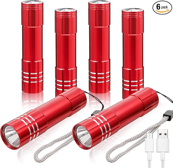 6 Pack LED Aluminum Small Mini USB C Rechargeable Flashlights, Handheld Small Flashlight Bulk for Kids, Portable Camping Bright High Lumens Flashlight Christmas Gifts (Red)