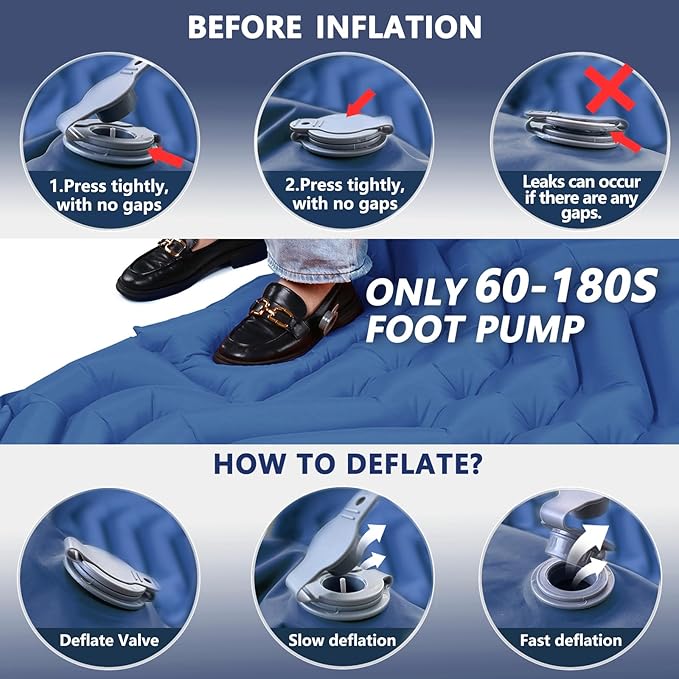 - 【Foot Press to Inflate-Only 1-3 mins Needed】There is no need to inflate with your hands, mouth, or a pump for our camping sleeping pad. It just only takes 1-3 mins after you inflate the sleeping mat fully by stamping the spot of the built-in pump with your foot. With anti-leakage films in the valves, you would never worry about air leaking when using it! Besides, super quick to deflate-take out the deflation plug.