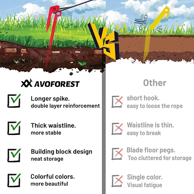 - SERVICE UPGRADE: While we are confident in our camp stakes, if you have any questions about the product, pm us, we are online 24 hours a day, AVOFOREST offers a lifetime warranty about the product.