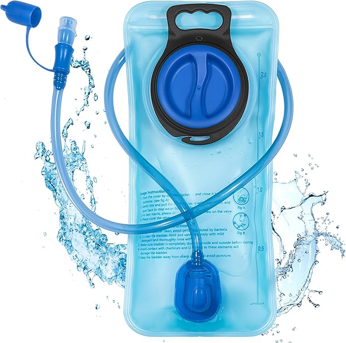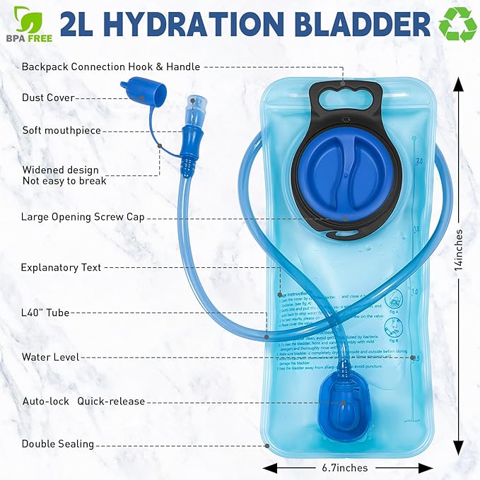 - BPA Free, Safe and Durable: All parts of our hiking water bladder are made of high-quality materials, with good wear resistance, bending resistance, tear resistance, and can withstand long-term use. The entire inner liner of the water pouch is made of high-quality food-grade EVA material, which is BPA-free and odorless, and will not leave odor in the beverage. The material of the hydration reservoir 2L is smooth inside, which can keep the water clean and beneficial to health