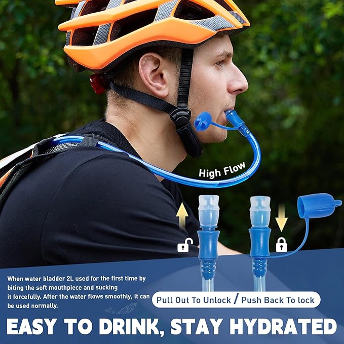 - Easy to Drink, Stay Hydrated: The hydration bladder's detachable drinking tube is 0.4” diameter and 40” long, it won't kink, the water flows smoothly, and provides a wholesome flow. You won't be slowed down with our high flow bite-valve, just gently bite the mouthpiece, conveniently control the water flow by biting, and water will not leak out when not biting. The soft silicone mouthpiece has a cover to prevent dust from entering, allowing you to easily sip and drink with peace of mind
