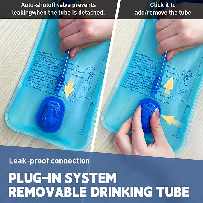 - Leak-proof Design, Good Sealing: The water bladder for hiking backpack adopts double sealing technology, which has passed the pneumatic pressure test, is pressure-resistant and ensures that the water bag is 100% leak-proof. The base connector uses a plug-in system, and the quick release and automatic shut-off valve prevents leakage after the tube is removed, and allows the tube to be easily disconnected from the water reservoir for filling, cleaning and storage